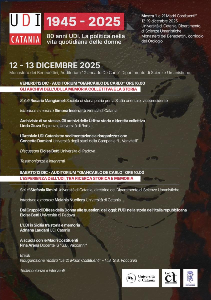 Sono previste due sessioni (archivistica, il 12 dicembre, coordinata dalla professoressa Simona Inserra, e storica, il 13 dicembre, coordinata dalla professoressa Melania Nucifora) che vedranno la partecipazione di Pina Arena (IS Vaccarini), Eloisa Betti (Università di Padova), Concetta Damiani (Università della Campania Vanvitelli), Linda Giuva (Università di Roma, La Sapienza), Adriana Laudani (UDI Catania), Rosario Mangiameli (Società di Storia Patria per la Sicilia Orientale). Nel corso dell'evento sarà inaugurata la mostra "Le 21 Madri Costituenti", a cura dell'IS Vaccarini, visitabile presso il Corridoio dell'Orologio del Monastero dei Benedettini.