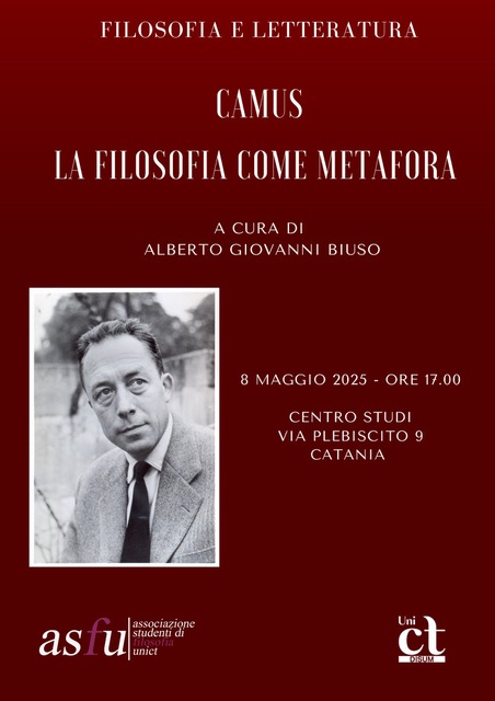 Per il ciclo 2025 «Filosofia e letteratura», organizzato dalla Associazione Studenti di Filosofia Unict (ASFU), giovedì 8 maggio 2025 alle ore 17.00 al Centro Studi di via Plebiscito 9 (Catania) Alberto Giovanni Biuso terrà il primo di due incontri dedicati all’opera di Albert Camus: Camus. La filosofia come metafora