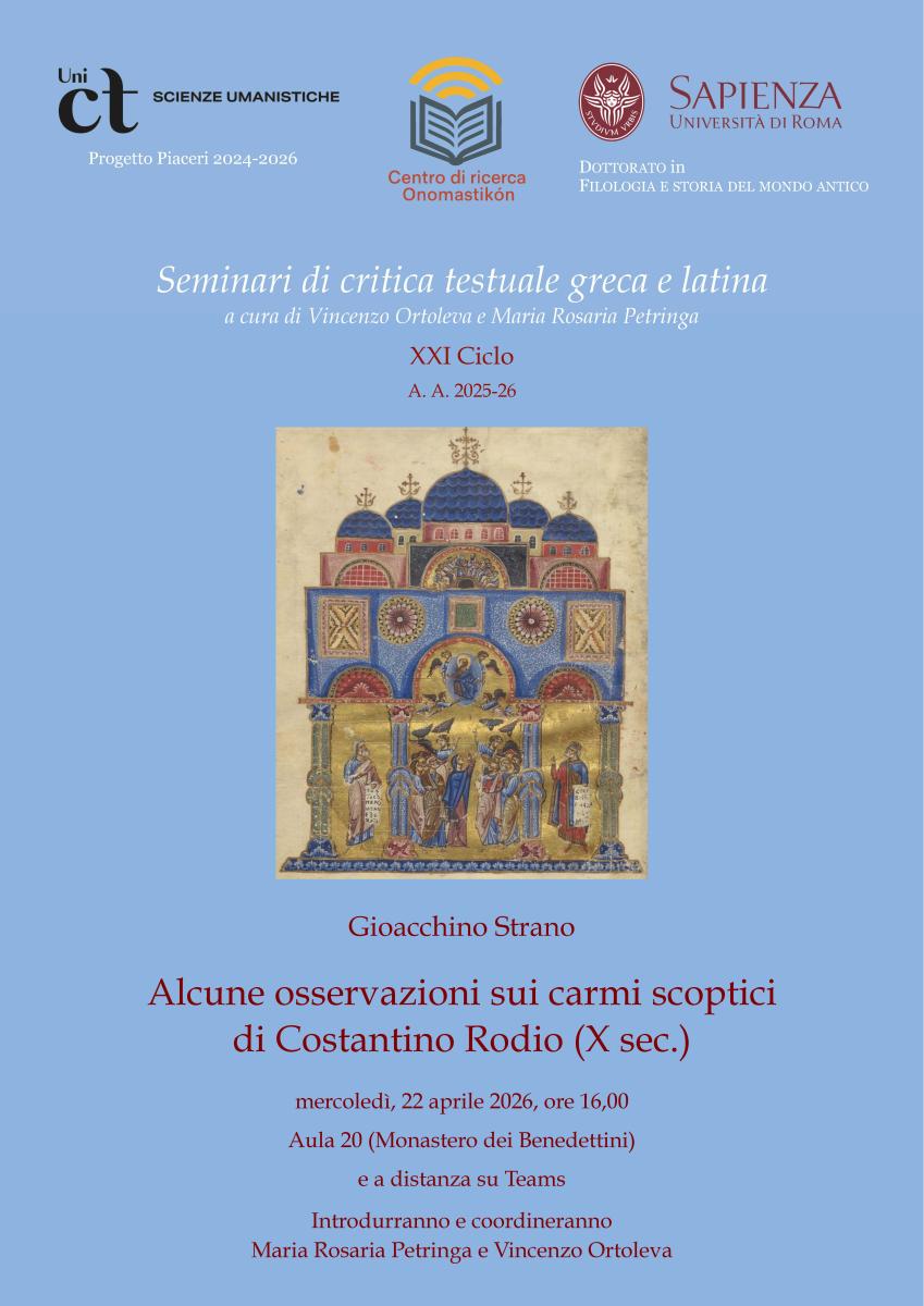 Mercoledì, 22 aprile 2026 alle ore 16,00, nell’Aula 20 del Monastero dei Benedettini e a distanza sulla Piattaforma Teams, nell’ambito dei “Seminari di critica testuale greca e latina del Centro di ricerca Onomastikón” (XXI ciclo), il Prof. Gioacchino Strano terrà un seminario dal titolo "Alcune osservazioni sui carmi scoptici di Costantino Rodio (X sec.)". Introdurranno e coordineranno Maria Rosaria Petringa e Vincenzo Ortoleva.
