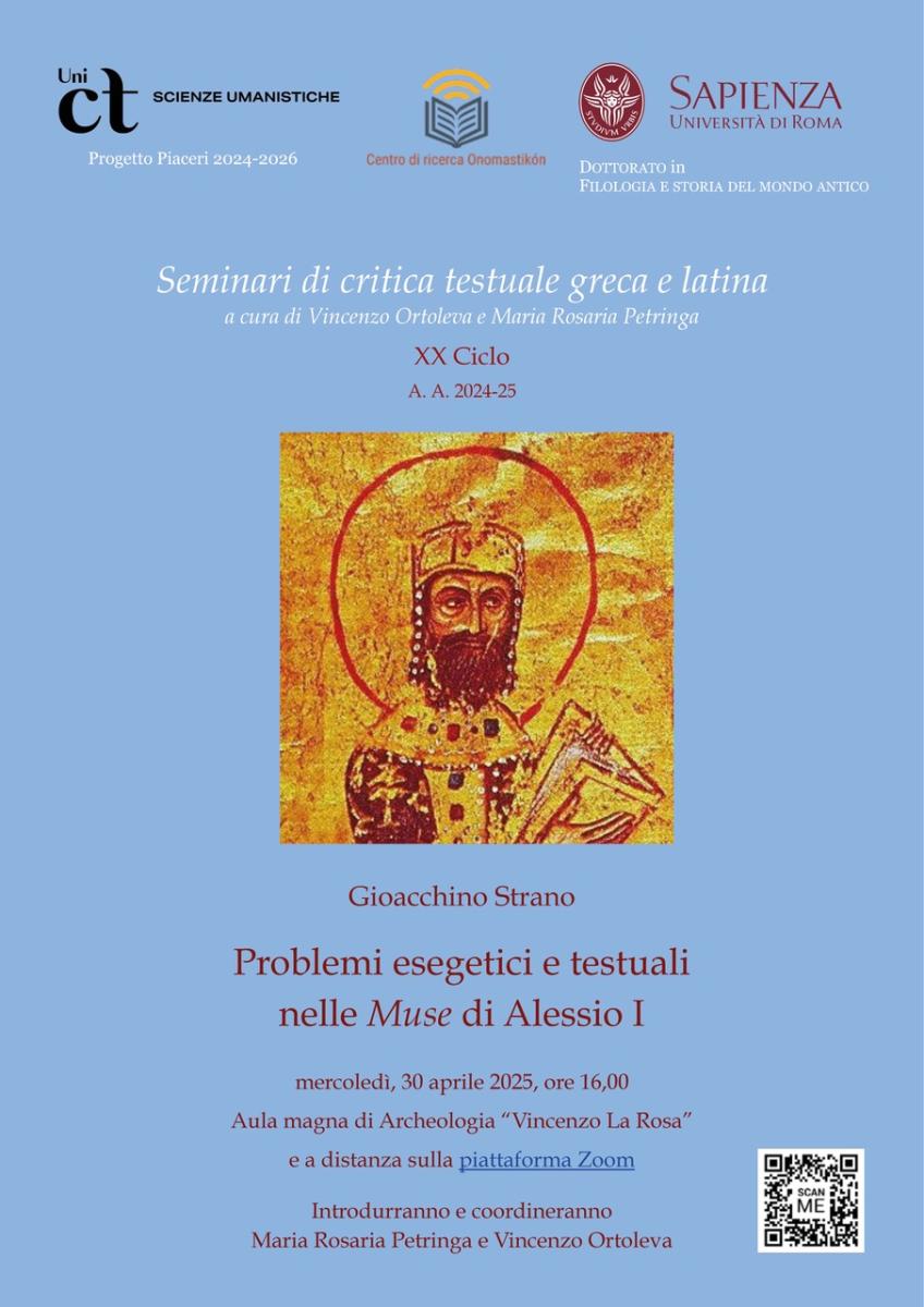 Mercoledì, 30 aprile 2025 alle ore 16,00, nell’Aula magna di Archeologia “Vincenzo La Rosa” e a distanza sulla Piattaforma Zoom: https://uniroma1.zoom.us/j/85232884970, nell’ambito dei “Seminari di critica testuale greca e latina” (XX ciclo), il Prof. Gioacchino Strano terrà un seminario dal titolo "Problemi esegetici e testuali nelle Muse di Alessio I". Introdurranno e coordineranno Maria Rosaria Petringa e Vincenzo Ortoleva.