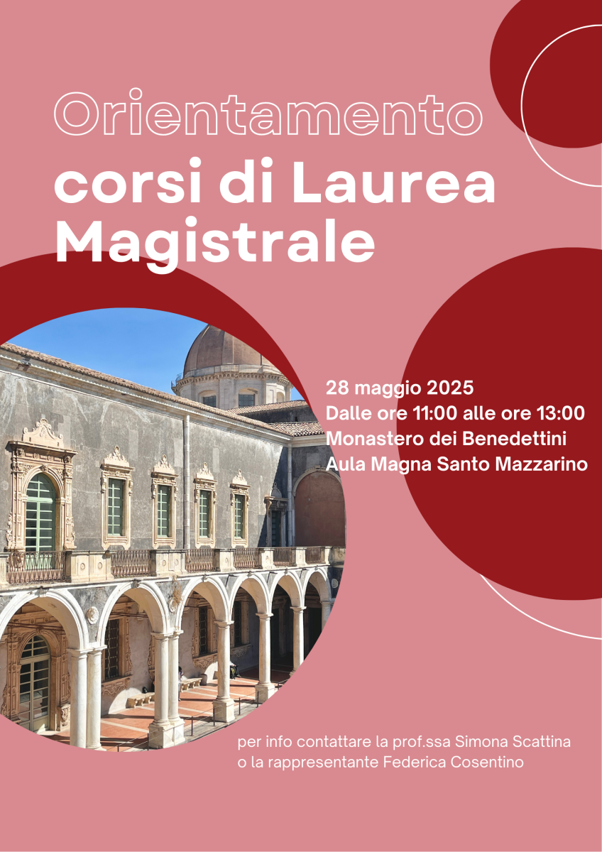 Si comunica a studenti e studentesse che mercoledì 28 maggio, dalle ore 11:00 alle ore 13:00 presso l'aula Santo Mazzarino, si terrà la presentazione dei Corsi di Laurea Magistrale del Dipartimento di Scienze Umanistiche.