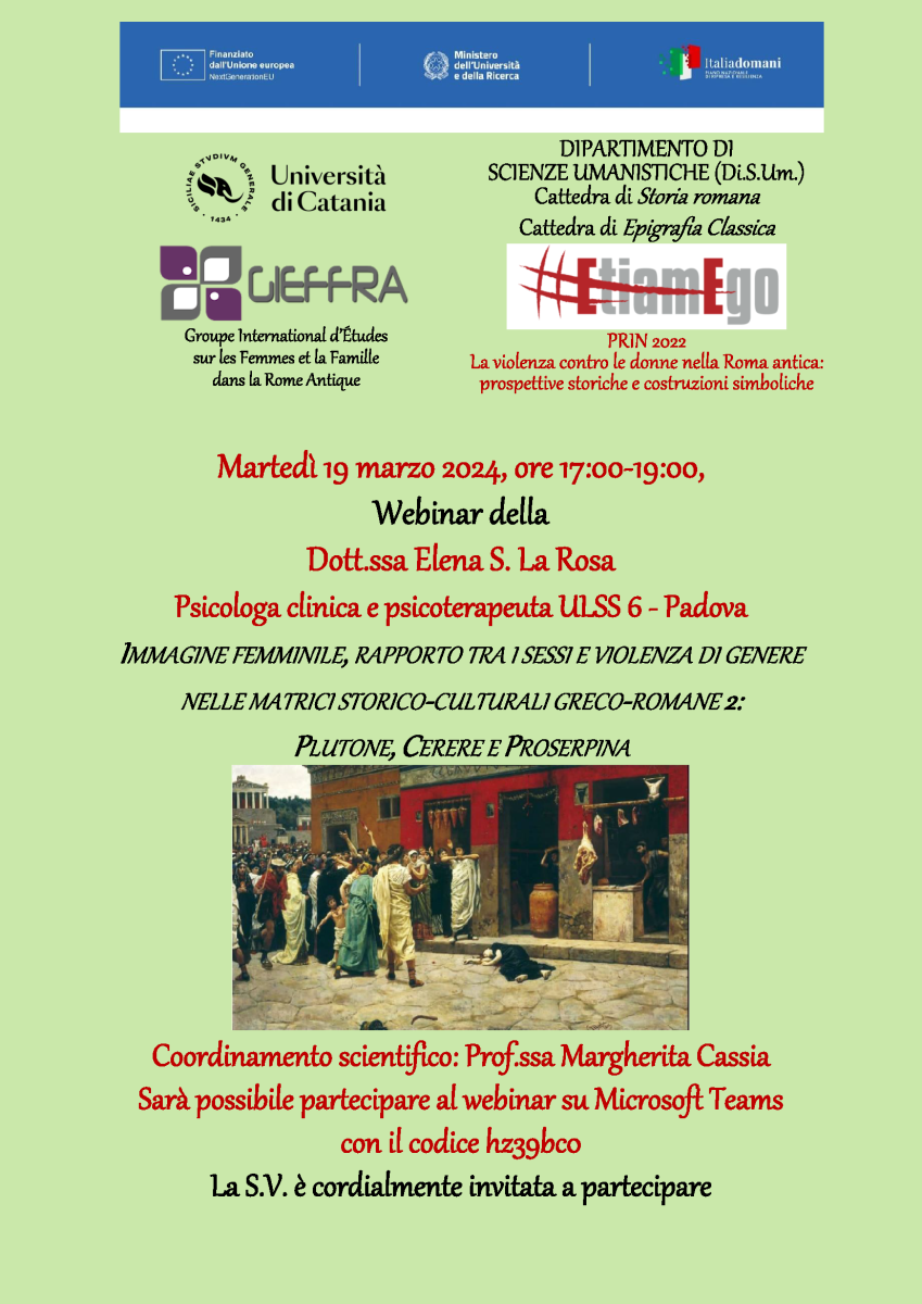 Martedì 19 marzo 2024, dalle ore 17 alle ore 19, si terrà il Webinar della Dott.ssa Elena S. La Rosa (Psicologa clinica e psicoterapeuta ULSS 6 - Padova) dal titolo Immagine femminile, rapporto tra i sessi e violenza di genere nelle matrici storico-culturali greco-romane 2: Plutone, Cerere e Proserpina. Il seminario – scientificamente coordinato dalla Prof.ssa Margherita Cassia, Cattedre di Storia romana ed Epigrafia classica del Dipartimento di Scienze Umanistiche (DISUM) – fa parte delle iniziative collegate al Groupe International d’Études sur les Femmes et la Famille dans la Rome Antique (GIEFFRA), e al PRIN 2022 – #EtiaMEgo. La violenza contro le donne nella Roma antica: prospettive storiche e costruzioni simboliche.