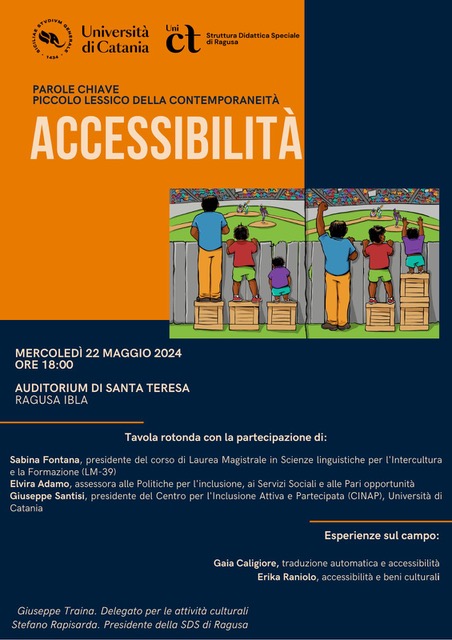 Il 22 maggio 2024, alle ore 18.00, presso l'auditorium di Santa Teresa, si parlerà di ACCESSIBILITA' attraverso una tavola rotonda a cui parteciperanno la prof.ssa Sabina Fontana (presidente del Cds in Scienze linguistiche per l'Intercultura e la Formazione), la dott.ssa Elvira Adamo (assessore del Comune di Ragusa con delega alle Politiche per l'Inclusiome, i Servizi sociali e le Pari opportunità), il prof. Giuseppe Santini (presidente del Centro per l'Inclusione Attiva e Partecipata dell'Università di Catania).