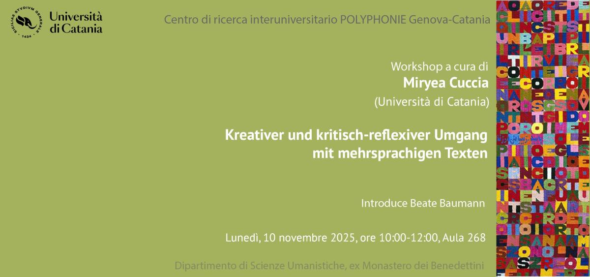 La dott.ssa Miryea Cuccia (Università di Catania) terrà un workshop dal titolo “Kreativer und kritisch-reflexiver Umgang mit mehrsprachigen Texten”. Introduce Beate Baumann.