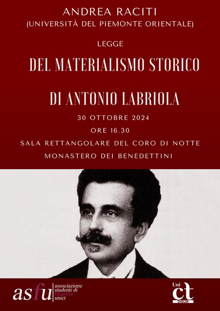 Mercoledì 30 ottobre 2024 alle ore 16.30, presso la Sala rettangolare del Coro di Notte del Monastero dei Benedettini, Andrea Raciti leggerà e discuterà alcuni brani del testo di Antonio Labriola Del materialismo storico. Dilucidazione preliminare (1896)