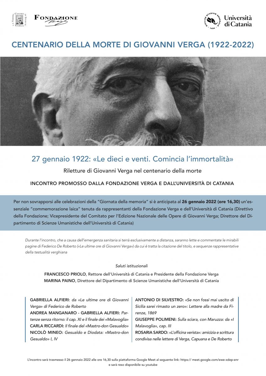 Per non sovrapporsi alle celebrazioni della “Giornata della memoria” si è anticipata al 26 gennaio 2022 (ore 16,30) un’essenziale “commemorazione laica” del grande scrittore, tenuta da rappresentanti della Fondazione Verga e dell’Università di Catania. Durante l’incontro, che a causa dell’emergenza sanitaria si terrà esclusivamente a distanza, saranno lette e commentate le mirabili pagine di Federico De Roberto («Le ultime ore di Giovanni Verga») da cui è tratta la citazione del titolo, e sequenze rappresentative della testualità verghiana.