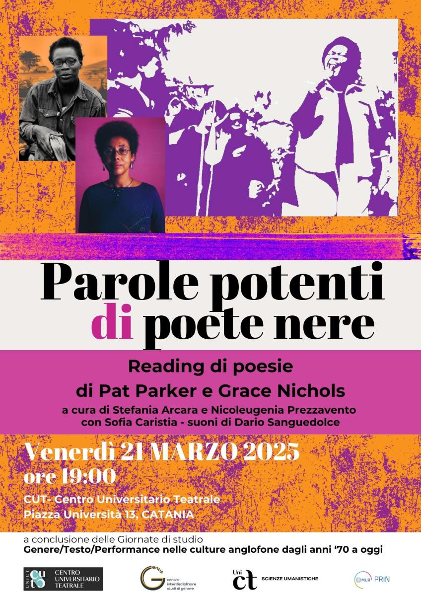 In occasione della Giornata Mondiale della Poesia, venerdì 21 marzo 2025, alle ore 19.00, al CUT – Centro Universitario Teatrale (Piazza Università 13), si terrà Parole potenti di poete nere - Reading di poesie della poeta afroamericana Pat Parker (1944-1989) e della poeta guyanese Grace Nichols (1950-), per la prima volta tradotte in italiano.