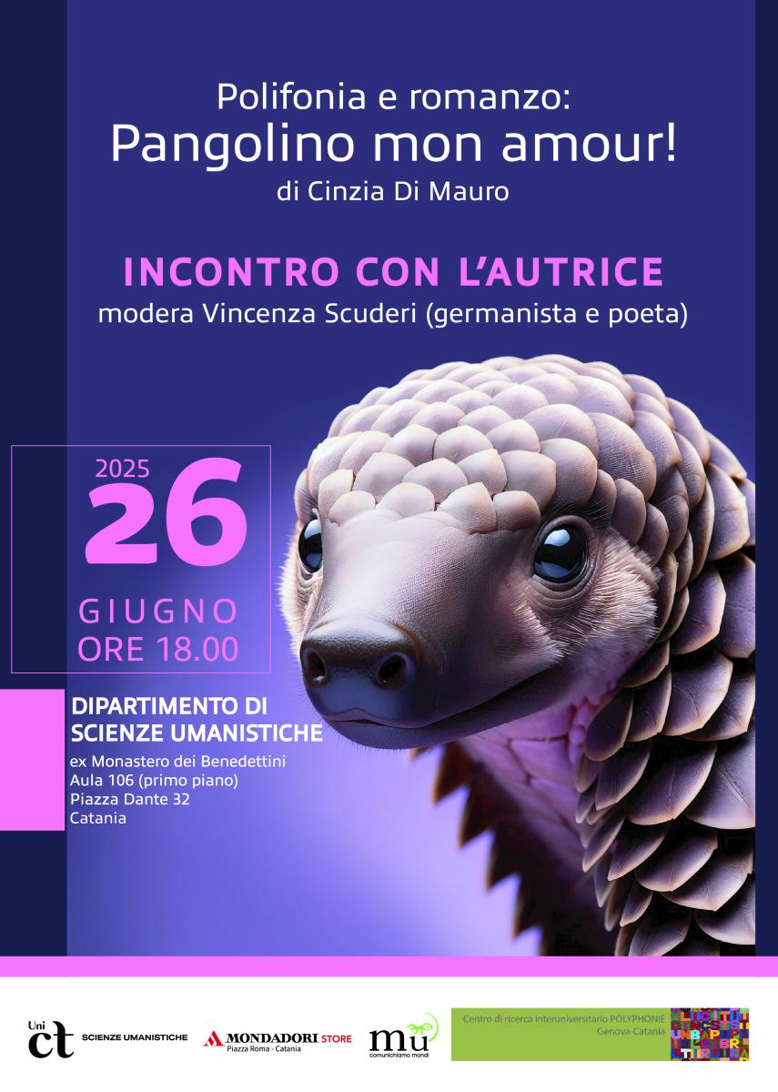 Giovedì 26 giugno alle 18,00, si svolge presso il DISUM (aula 106 dell’ex Monastero dei Benedettini) un incontro dal titolo Polifonia e romanzo: “Pangolino mon amour!” di Cinzia Di Mauro (All Around 2025). Dialoga con l’autrice Vincenza Scuderi (germanista e poeta). Il romanzo satirico di Cinzia Di Mauro, costruito sul principio della commistione di stili, registri linguistici e generi, in un susseguirsi di intrecci e personaggi, consente di riflettere sul principio polifonico, uno dei tratti distintivi del romanzo moderno e che oggi sta ritornando prepotentemente sulla scena.