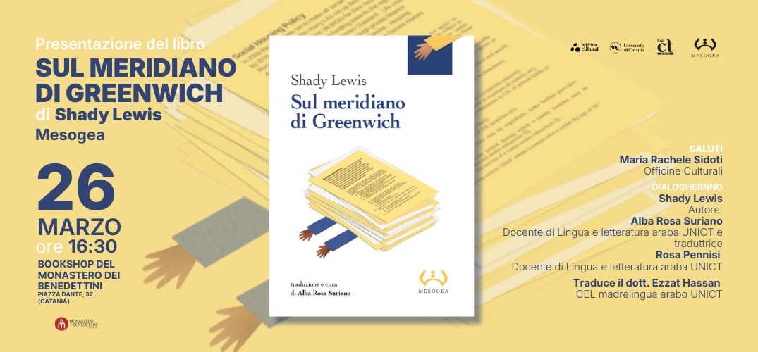 Giovedì 26 marzo alle 16.30 presso Officine Culturali al Monastero dei Benedettini di Catania si terranno le presentazioni del romanzo "Sul Meridiano di Greenwich" dello scrittore egiziano Shady Lewis alla presenza dell'autore.