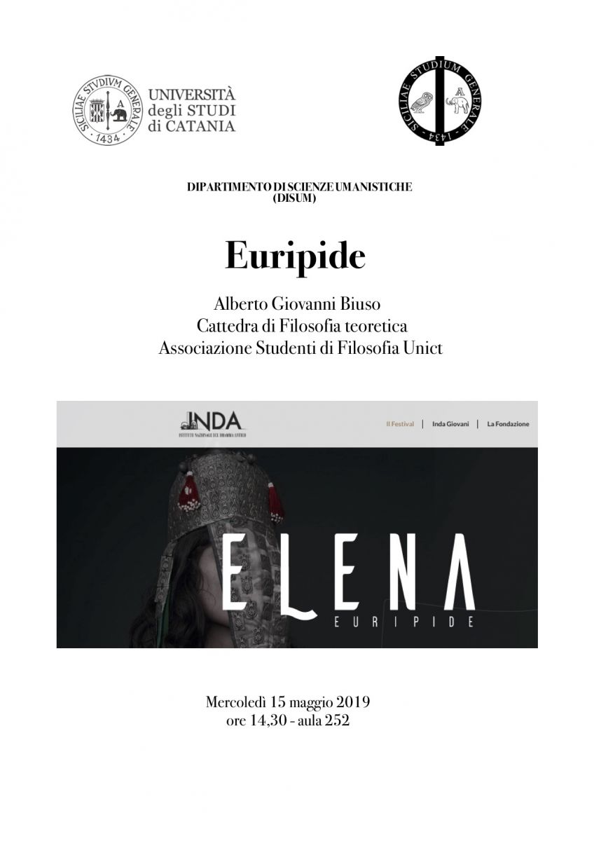 Con un gruppo di studenti andremo a vedere Elena a Siracusa. Per prepararci, l'Associazione Studenti di Filosofia Unict ha organizzato un incontro nel quale parleremo di Euripide. L'appuntamento è per mercoledì 15.5.2019 alle 14,30 nell'Aula 252.