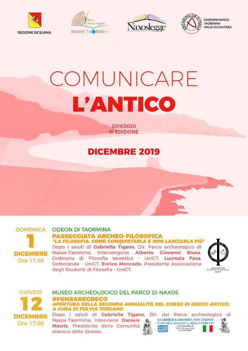 Domenica 1.12.2019 alle 11,00 nel riscoperto e restaurato Odéon romano di Taormina l’Associazione Studenti di Filosofia Unict e il Parco Archeologico di Naxos-Taormina organizzano un incontro dal titolo La filosofia. Come conquistarla e non lasciarla più.
