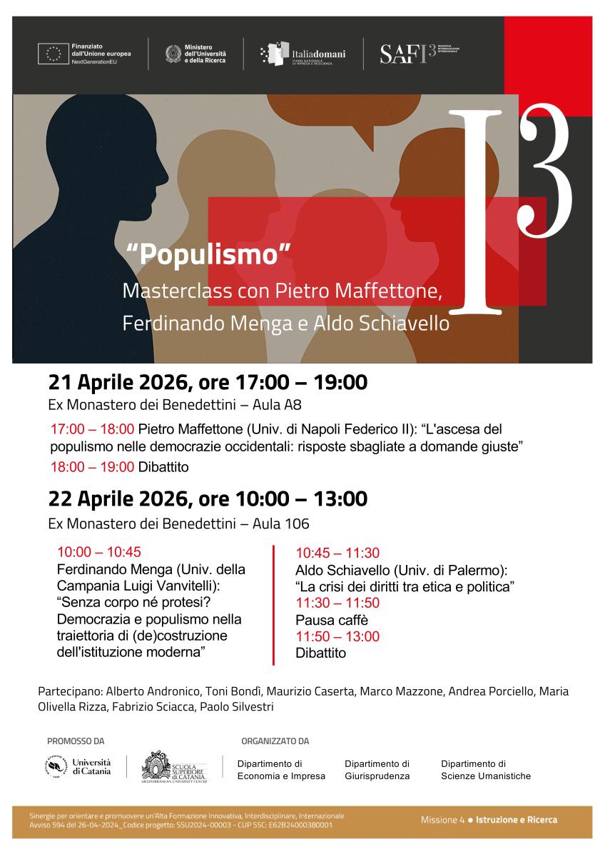 Il 21 e 22 aprile ospiteremo al DISUM una Masterclass sul tema del “Populismo”, co-organizzata con i Dipartimenti di Giurisprudenza ed Economia all'interno del progetto SAFI3, promosso dalla Scuola Superiore di Catania.