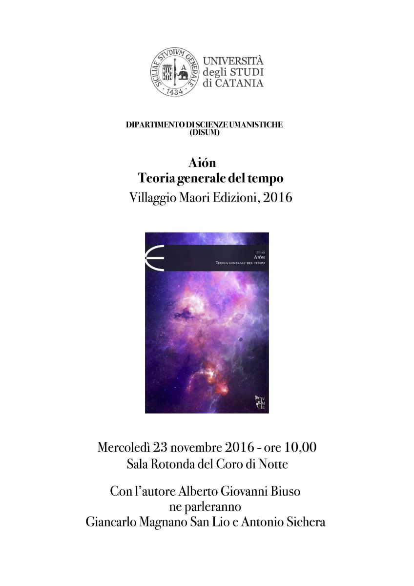 Mercoledì 23.11.2016 alle 10,00 nella Sala Rotonda del Coro di Notte verrà presentato il libro di Alberto Giovanni Biuso Aión. Teoria generale del tempo (Villaggio Maori Edizioni, 2016).