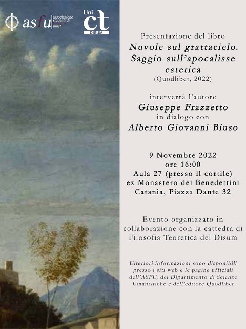 Mercoledì 9 novembre 2022 alle 16.00 nell'aula 27 del Monastero dei Benedettini verrà presentato il volume Nuvole sul grattacielo. Saggio sull'apocalissi estetica (Quodlibet, 2022), di Giuseppe Frazzetto, docente all'Accademia di Belle Arti di Catania e già professore di Storia dell’arte contemporanea al Disum.