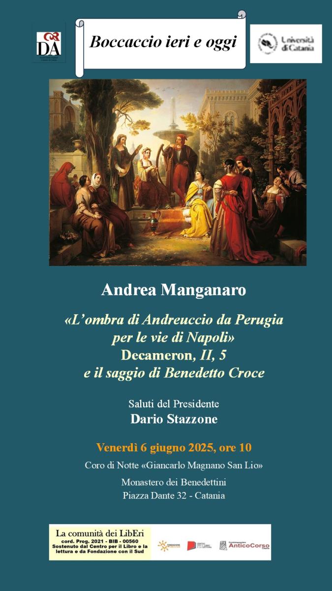 Venerdì 6 giugno 2025, alle ore 10, al Coro di notte "Giancarlo Magnano San Lio", nell’ambito del ciclo “Boccaccio ieri e oggi”, organizzato, in occasione del 650° anniversario della morte dell’autore del Decameron, dalla Società Dante Alighieri e dal Dipartimento di Scienze Umanistiche, Andrea Manganaro terrà la conferenza «L’ombra di Andreuccio da Perugia per le vie di Napoli». Decameron, II, 5 e il saggio di Benedetto Croce.