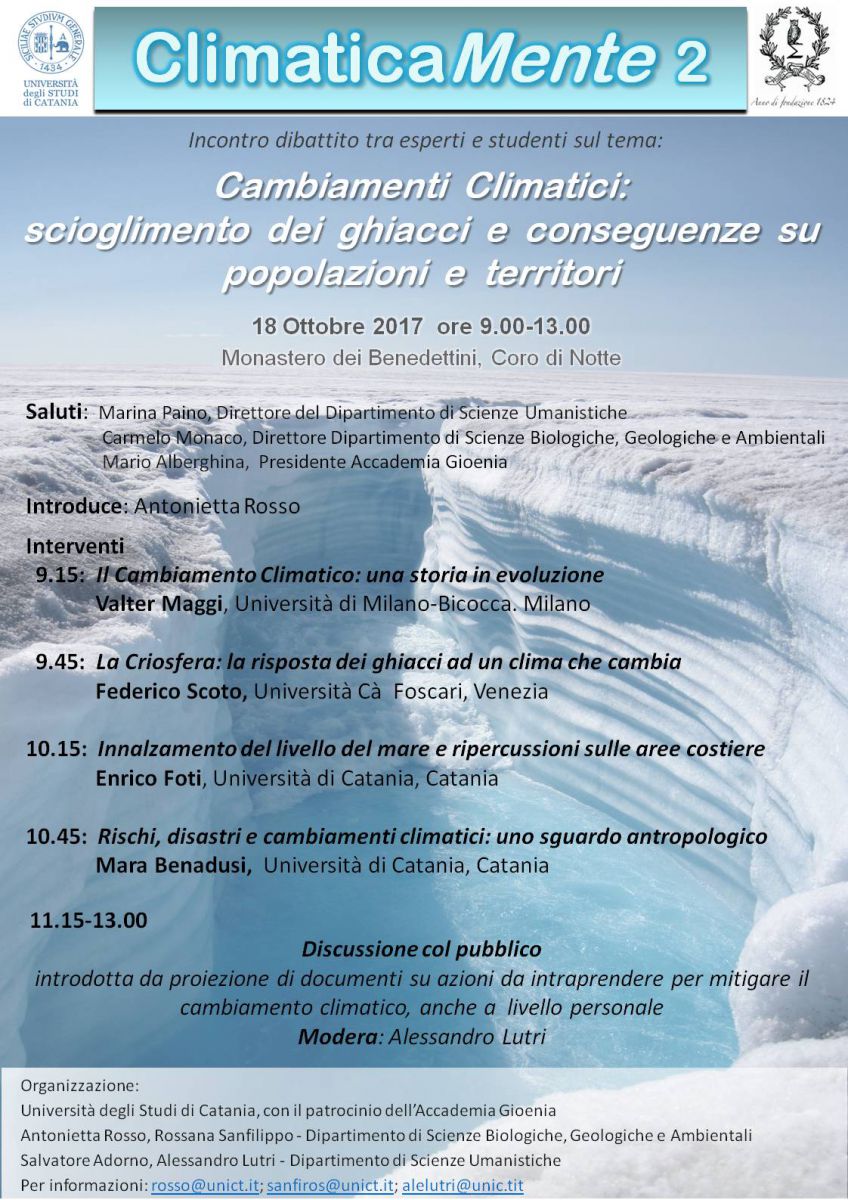 Mercoledì 18.10.2017 dalle 9,00 alle 13,00 nel Coro di Notte si svolgerà un incontro-dibattito dal titolo Cambiamenti climatici: scioglimento dei ghiacci e conseguenze sulle popolazioni e territori.