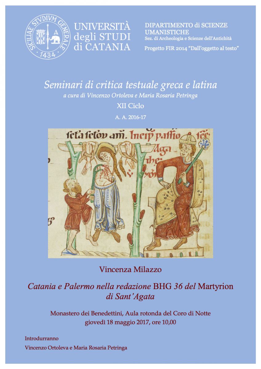 Giovedì 18.5.2017 alle 10,00 nell'Aula Rotonda del Coro di Notte Vincenza Milazzo terrà un seminario dal titolo Catania e Palermo nella redazione BHG del Martyrion di Sant'Agata.