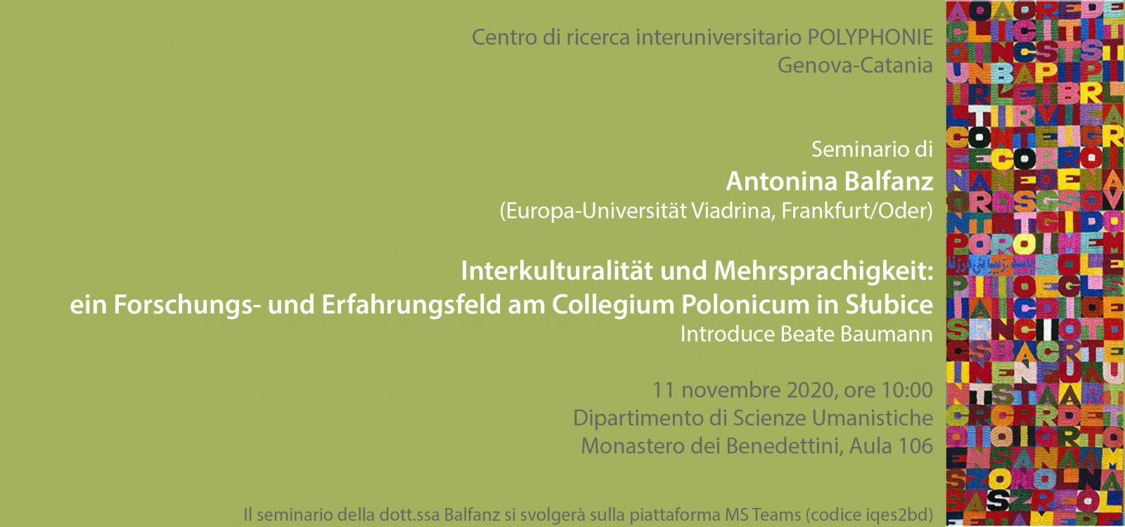 L’11 novembre 2020 alle ore 10:00 la dott.ssa Antonina Balfanz dell’Europa-Universität Viadrina di Frankfurt/Oder terrà un seminario su interculturalità e plurilinguismo. Il seminario dal titolo Interkulturalität und Mehrsprachigkeit: ein Forschungs- und Erfahrungsfeld am Collegium Polonicum in Słubice è organizzato dal Centro di ricerca interuniversitario POLYPHONIE (Genova-Catania) e si svolgerà sulla piattaforma MS Teams (codice iqes2bd).