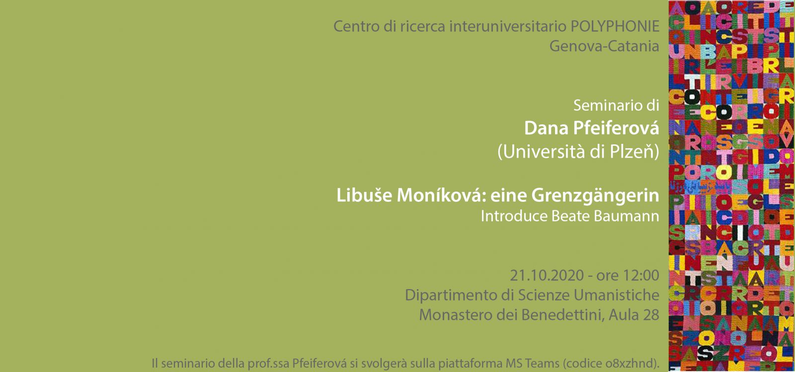 Il 21 ottobre 2020 alle ore 12:00 la prof.ssa Dana Pfeiferová dell’Università di Plzeň terrà un seminario su Libuše Moníková. Il seminario, organizzato dal Centro di ricerca interuniversitario POLYPHONIE (Genova-Catania), si svolgerà sulla piattaforma MS Teams (codice o8xzhnd).
