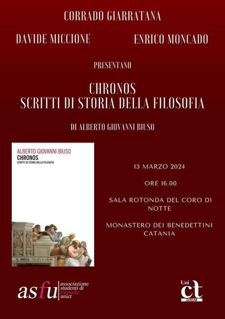 Mercoledì 13 marzo 2024 alle ore 16.00 nella Sala Rotonda del Coro di Notte (Monastero dei Benedettini) si terrà la presentazione del libro Chronos. Scritti di storia della filosofia (Mimesis 2023) di Alberto Giovanni Biuso. Insieme all’autore ne discuteranno Corrado Giarratana, Davide Miccione ed Enrico Moncado.