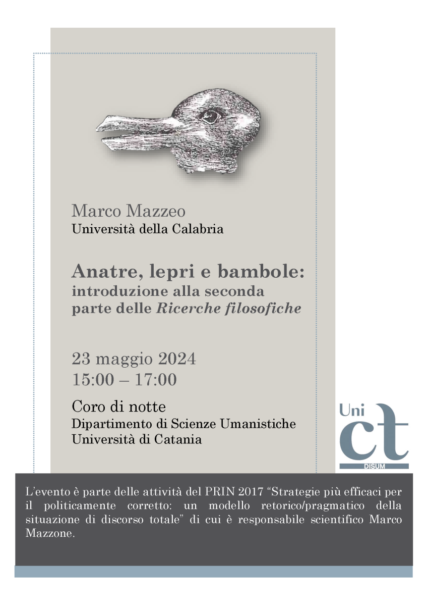 Giovedì 23 maggio, alle ore 15 presso il Coro di Notte del Monastero dei Benedettini, Marco Mazzeo (Università della Calabria) terrà una conferenza dal titolo “Anatre, lepri e bambole: introduzione alla seconda parte delle Ricerche Filosofiche di Wittgenstein”. L’evento è parte delle attività di disseminazione del PRIN 2017 “Strategie più efficaci per il politically correct” di cui è responsabile scientifico Marco Mazzone.