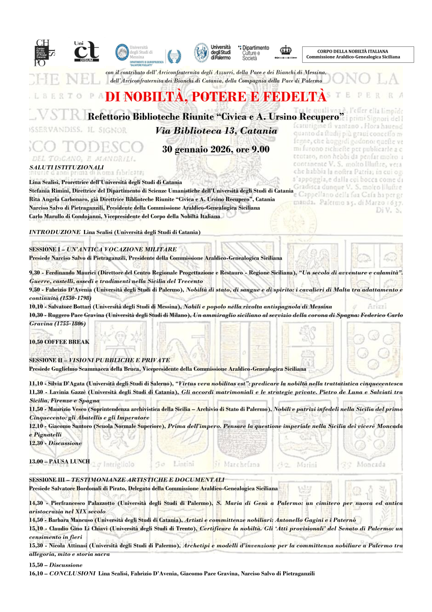 Venerdì 30 gennaio, presso il Refettorio delle Biblioteche Riunite "Civica e A. Ursino Recupero", dalle ore 9:00, si svolgerà il convegno "Di nobiltà, potere e fedeltà", organizzato dalla Prof.ssa Lina Scalisi, Prorettrice dell'Università di Catania, il Prof. Giacomo Pace Gravina, Università di Messina, il Prof. Fabrizio D'Avenia, Università di Palermo, il dott. Narciso Salvo di Pietraganzili, Presidente della Comissione Araldico-genealogica siciliana, ed il CHISPO - Center for the History of Power.