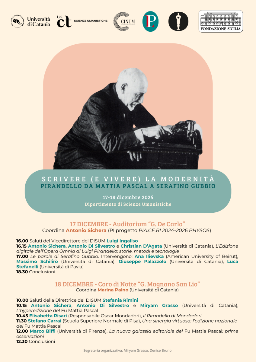 Mercoledì 17 e giovedì 18 dicembre al Monastero dei Benedettini si terrà il convegno “Scrivere (e vivere) la modernità: Pirandello da Mattia Pascal a Serafino Gubbio”. L’evento rientra nell’ambito del Progetto PIA.CE.RI 2024-2026 PHYSOS (PI A. Sichera) dedicato alla realizzazione dell’hyperedizione dei Quaderni di Serafino Gubbio operatore. Il convegno sarà anche un’occasione per esporre il modello di edizione digitale chiamato Hyperedizione e messo a punto per la prima volta sul Fu Mattia Pascal curato da A. Sichera e A. Di Silvestro.