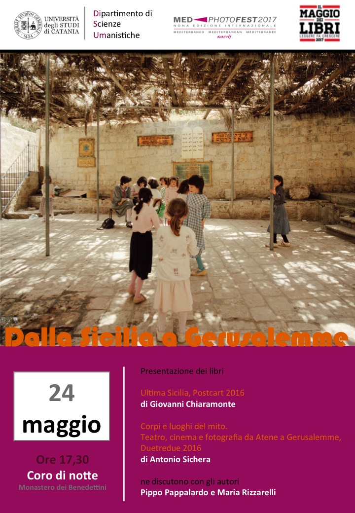 Dalla Sicilia a Gerusalemme Mercoledì 24.5.2017 alle 17.30 nel Coro di Notte si svolgerà un incontro dal titolo Dalla Sicilia a Gerusalemme. L'iniziativa fa parte del Med Photo Fest 2017. Condividi Facebook Twitter Whatsapp Telegram Email
