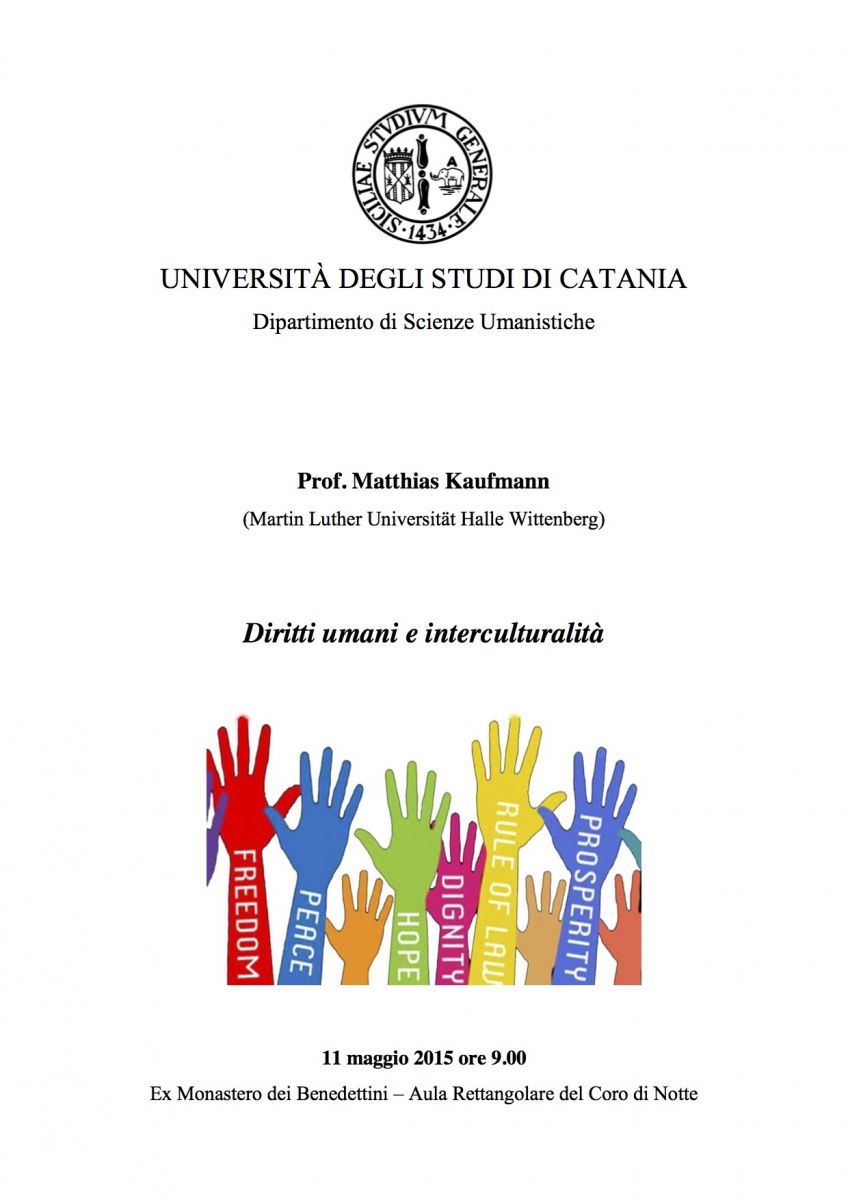 Diritti umani e interculturalità Lunedì 11.5.2015 alle 9,00 nell'Aula rettangolare del Coro di Notte Matthias Kaufmann (Martin Luther Università¤t - Halle Wittenberg) terrà un seminario dal titolo Diritti umani e interculturalità . Condividi Facebook Twitter Whatsapp Telegram Email