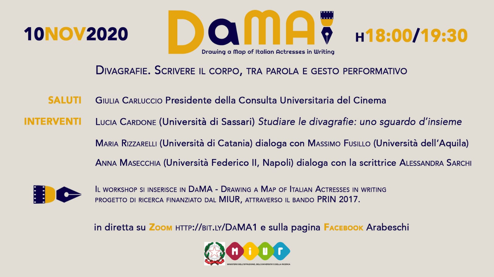 10 novembre 2020 h. 18:00-19:30 piattaforma zoom al link http://bit.ly/DaMA1 e diretta FaceBook sulla pagina di Arabeschi