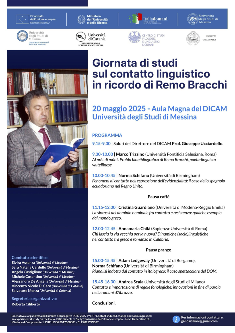 Si comunica che martedì 20 maggio si terrà la Giornata di studi sul contatto linguistico in ricordo di Remo Bracchi, organizzato nell'ambito del PRIN 2022 PNRR "Contact-induced change and sociolinguistics: an experimental study on the Gallo-Italic dialects of Sicily" (Università di Messina - Università di Catania).