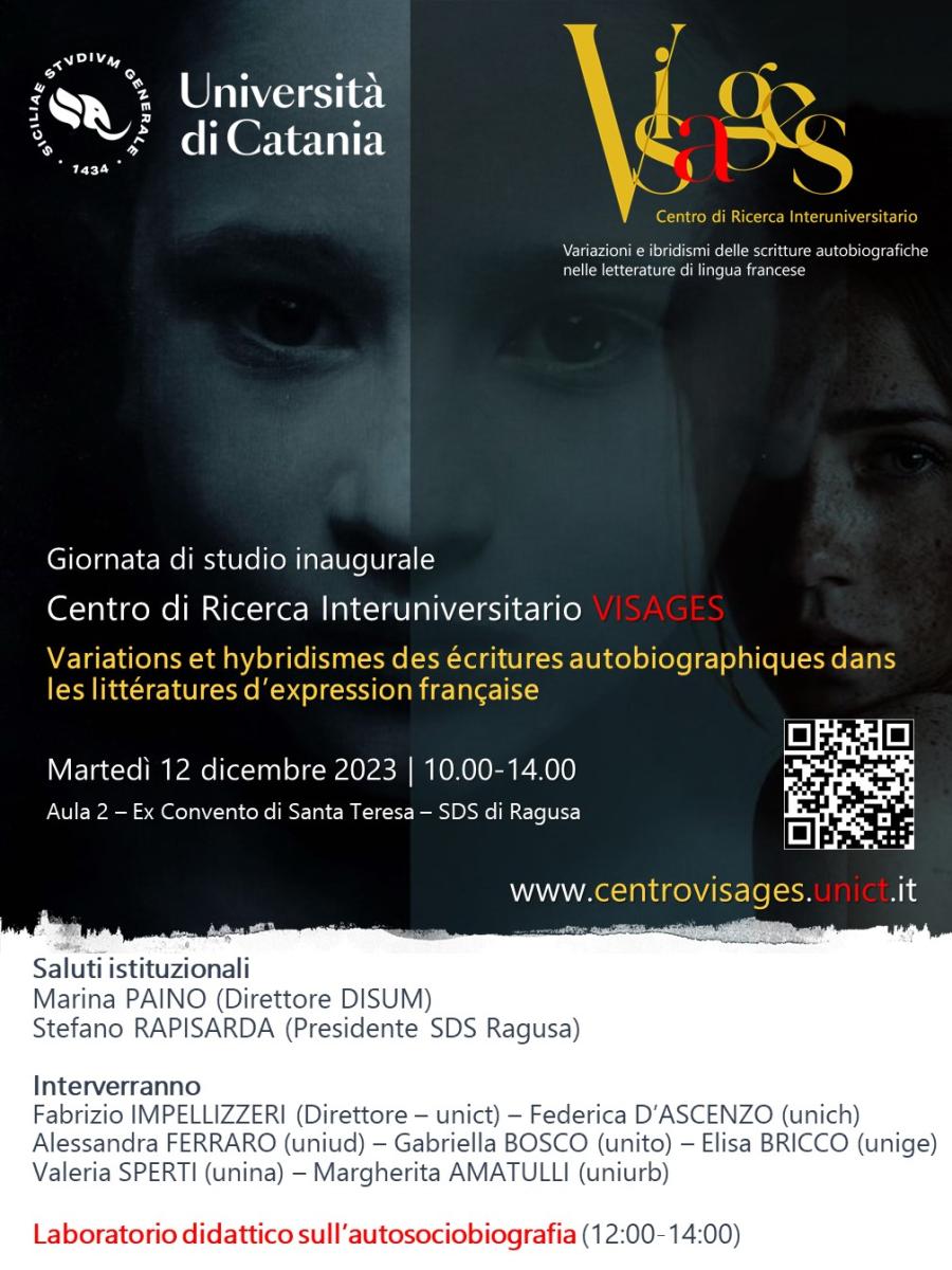 Martedì 12 dicembre, dalle 10.00 alle 14.00, nell’Aula 2 dell’ex Convento di Santa Teresa della Struttura Didattica Speciale a Ragusa Ibla, si terrà la giornata di studio inaugurale del Centro Visages - Variazioni e ibridismi delle scritture autobiografiche nelle letterature di lingua francese.