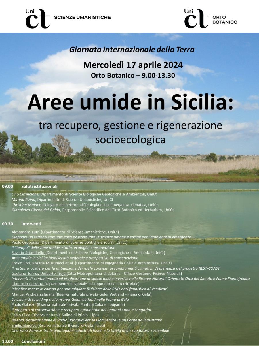 L’incontro organizzato dal prof. Alessandro Lutri (Dipartimento di Scienze umanistiche) e dal prof. Saverio Sciandrello (Dipartimento di Scienze Biologiche, Geologiche e Ambientali), con i contributi di ricercatori e dei responsabili di alcune delle aree umide protette siciliane (private e pubbliche), intende celebrare la Giornata internazionale della Terra (Earth day), proponendo una riflessione sul ruolo delle aree umide in una epoca di cambiamenti climatici, sulla loro drastica riduzione globale (circa il 35%) e sulla ricchezza di vita in cui sono coinvolti in maniera collaborativa il mondo vegetale, animale e umano.