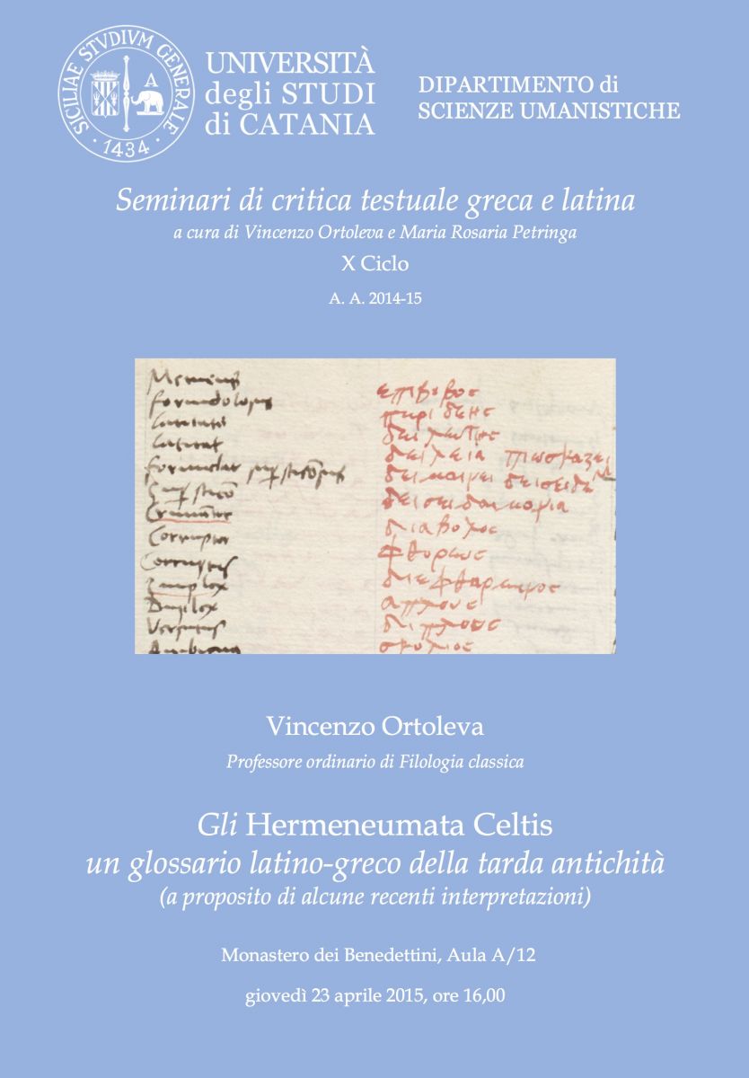 Giovedì 23.4.2015 alle 16,00 nell'Aula A12 Vincenzo Ortoleva terrà un seminario dal titolo Gli Hermeneumata Celtis un glossario latino-greco della tarda antichità (a proposito di alcune recenti interpretazioni).