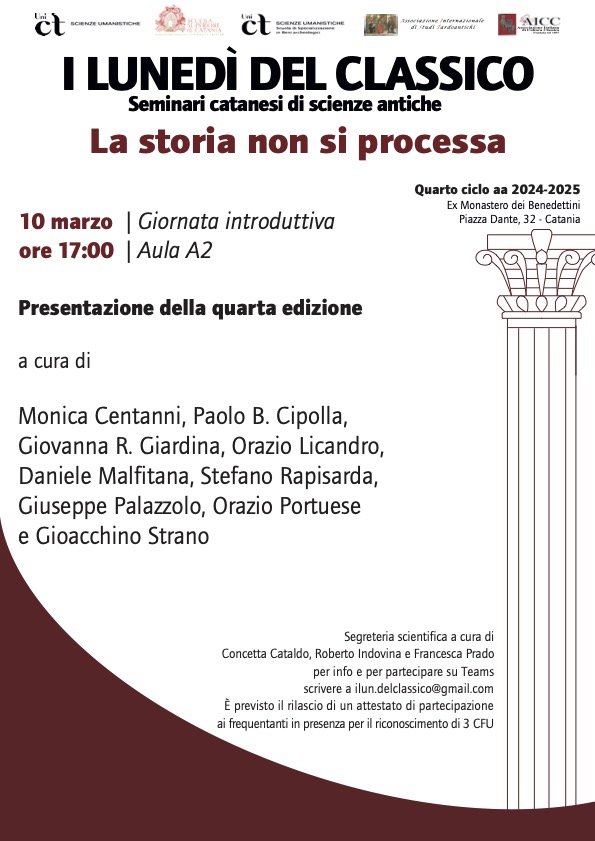 L’iniziativa, promossa dai docenti M. Centanni, P.B. Cipolla, G.R. Giardina, O. Licandro, D. Malfitana, O. Portuese. G. Strano, nasce dalla volontà del Dipartimento di Scienze Umanistiche, della Scuola Superiore di Catania, della Scuola di Specializzazione in Beni archeologici, con il patrocinio dell’Associazione Internazionale di Studi Tardoantichi e dell’Associazione Italiana di Cultura Classica, per favorire un maggior coinvolgimento degli studenti e un’apertura all’esterno, oltre il perimetro accademico, delle scienze antiche. Gli incontri hanno carattere interdisciplinare e costituiscono l’occasione per dialogare sul valore dei classici come risorsa di un presente che interroga il passato.