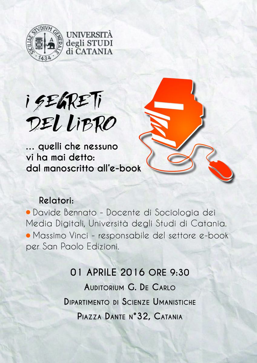 Venerdì 1.4.2016 alle 9,30 in Auditorium si terrà un incontro-conferenza dedicato al libro e all'e-book. Relatori Davide Bennato e Massimo Vinci.