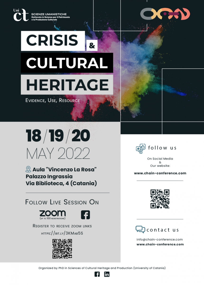 Il Dipartimento di Scienze Umanistiche dell’Università di Catania ospita dal 18 al 20 maggio 2022 la Conferenza internazionale CHAIN 2022 - Crisis and Cultural Heritage. Evidence, Use, Resource - organizzata dai dottorandi e dalle dottorande in Scienze per il Patrimonio e la Produzione Culturale.