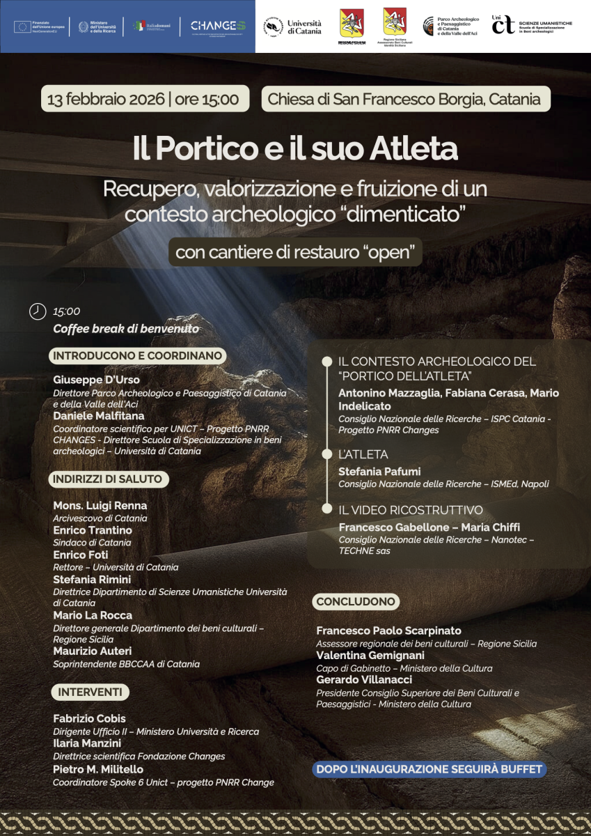 Interverranno: Mons. Luigi Renna, Arcivescovo di Catania; Enrico Trantino, Sindaco di Catania; Enrico Foti, Rettore Università di Catania; Stefania Rimini, Direttrice del Dipartimento di Scienze Umanistiche Università di Catania; Mario La Rocca, Direttore Generale Dipartimento dei Beni Culturali Regione Sicilia; Maurizio Auteri, Soprintendente BBCCAA di Catania; Fabrizio Cobis, Dirigente Ufficio II - Ministero Università e Ricerca; Ilaria Manzin, Direttrice scientifica Fondazione Changes; Pietro M.Militello, Coordinatore Spoke 6 UniCt - Progetto PNRR Changes; Antonino Mazzaglia, Fabiana Cerasa, Mario Indelicato, Consiglio Nazionale delle Ricerche - ISPC Catania - Progetto PNRR Changes; Stefania Pafumi, Consiglio delle Ricerche - ISMEd. Napoli; Francesco Gabellone e Maria Chiffi, CNR - Nanotecnologie - Technè sas. Concluderanno Francesco Paolo Scarpinato, Assessore Regionale dei Beni Culturali - Regione Sicilia; Valentina Gemignani, Capo di Gabinetto del Ministero della Culture; Gerardo Villanacci, Presidente Consiglio Superiore del Beni Culturali e Paesaggistici - Ministero della Cultura.