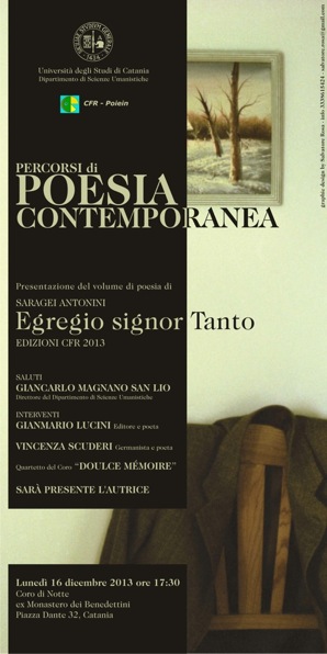 Il 16.12.2013 alle 17,30 nel Coro di Notte il Dipartimento di Scienze Umanistiche e le Edizioni CFR presentano l'ultima raccolta di poesia di Saragei Antonini, Egregio signor Tanto (Edizioni CFR "“ Collana Poiein, 2013), all'interno del ciclo Percorsi di poesia contemporanea.