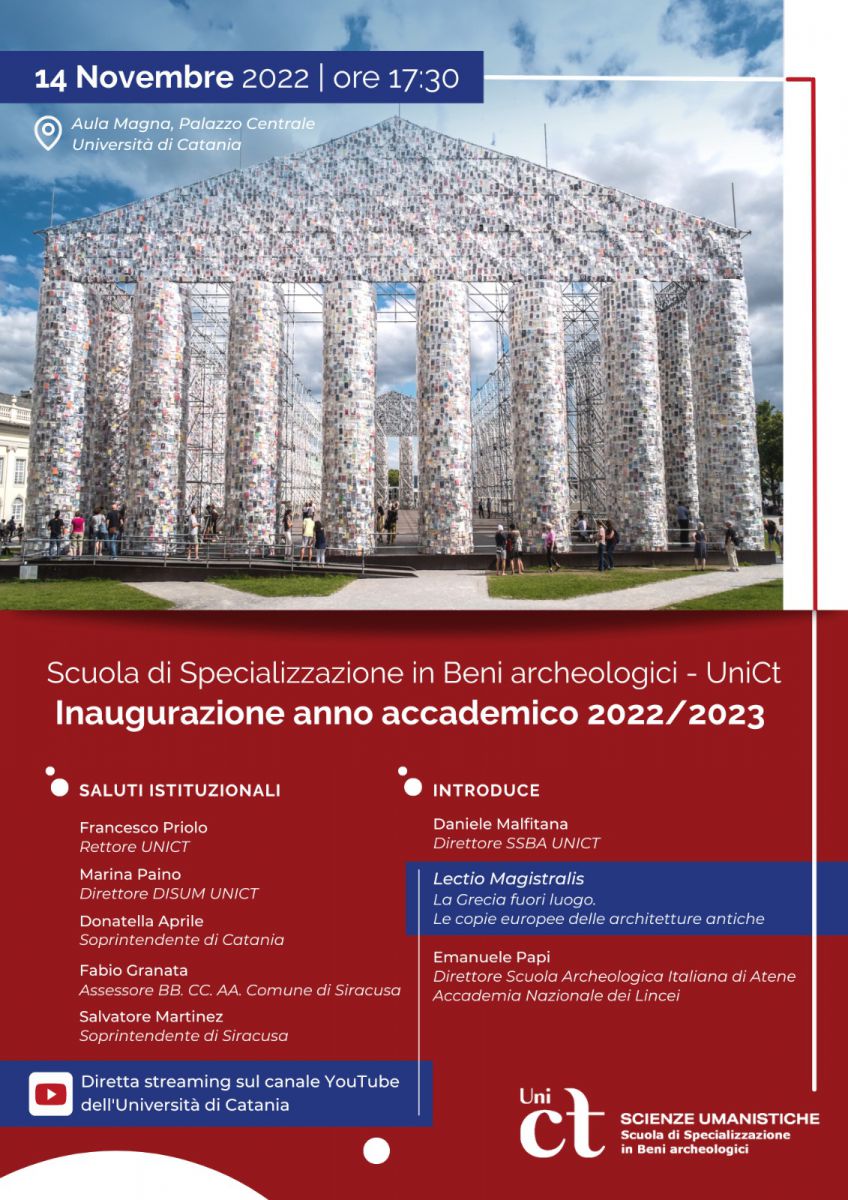 Lunedì 14 novembre 2022 alle 17:30, nell'aula magna del Palazzo Centrale dell'Università di Catania (Piazza Università, 2 - Catania), si svolge la cerimonia di inaugurazione dell'anno accademico 2022/23 della Scuola di Specializzazione in Beni archeologici.