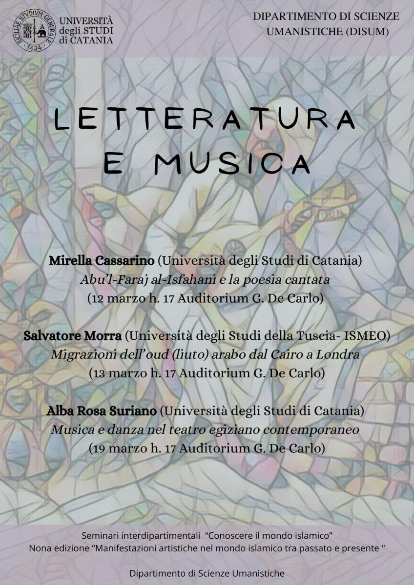 Il 12 e il 13 marzo, alle ore 17.00 nell'Auditorium G. De Carlo, si terranno i primi due incontri della IX edizione dei Seminari interdipartimentali 'Conoscere il mondo islamico', dedicata alle Manifestazioni artistiche islamiche fra passato e presente. Oggetto del seminario di Mirella Cassarino (Università di Catania) del 12 marzo sarà Abu’l-Faraj al-Isfahani e la poesia cantata, mentre il 13 marzo Salvatore Morra (Università degli Studi della Tuscia- ISMEO) si occuperà di Migrazioni dell’oud (liuto) arabo dal Cairo a Londra.