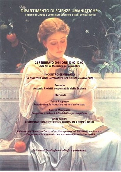 Il 28.2.2014 dalle 10,00 alle 13,00 nell'aula A8 si terrà un Incontro-Seminario dedicato alla Didattica della letteratura tra Scuola e Università .