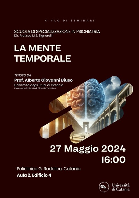 Lunedì 27 maggio 2024 alle 16.00 nell’Aula 2, Edificio 4 del Policlinico G. Rodolico si terrà il secondo seminario della Scuola di Specializzazione in Psichiatria, tenuto da Alberto Giovanni Biuso (Professore Ordinario di Filosofia teoretica al Disum) dal titolo La mente temporale.