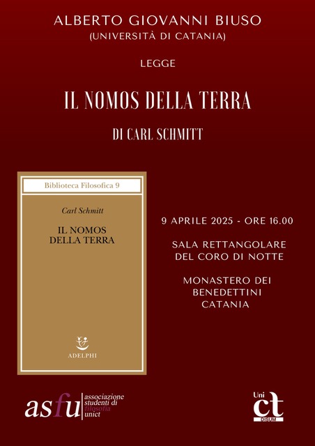 mercoledì 9 aprile 2025 alle ore 16.00 nella Sala rettangolare del Coro di Notte del Monastero dei Benedettini Alberto Giovanni Biuso legge Il Nomos della terra di Carl Schmitt.