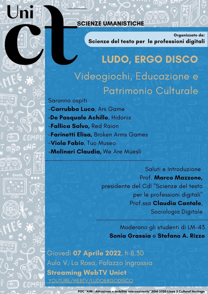 Giovedì 7 aprile alle ore 8:30 presso l’aula “La Rosa” di Palazzo Ingrassia, si terrà l’incontro “Ludo, ergo disco: Videogiochi, Educazione e Patrimonio Culturale”.