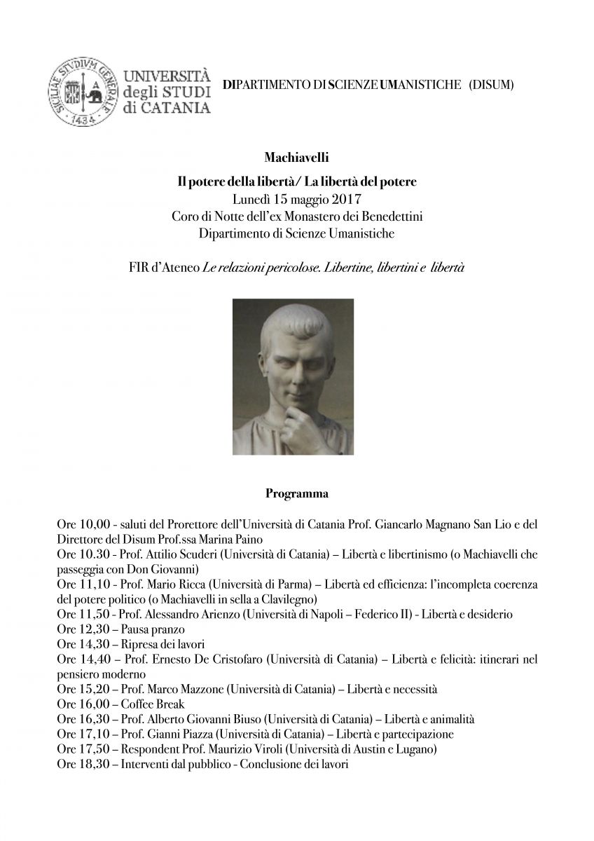 Da lunedì 15 a mercoledì 17 maggio 2017 in varie sedi del Dipartimento di Scienze Umanistiche e della Scuola Superiore di Catania si svolgerà un Convegno dal titolo Machiavelli: Potere e Libertà.