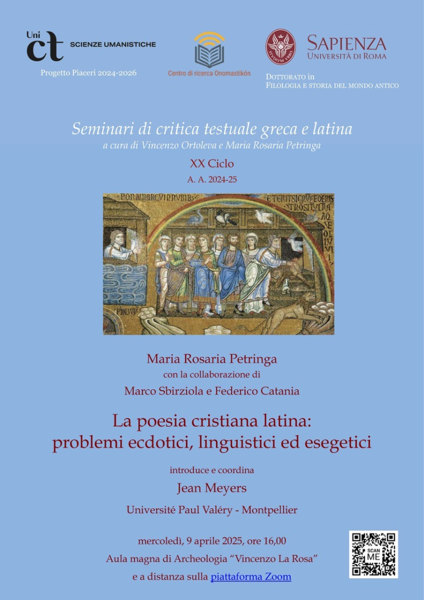 Mercoledì, 9 aprile 2025 alle ore 16:00, nell’Aula magna di Archeologia “Vincenzo La Rosa” e a distanza sulla Piattaforma Zoom, nell’ambito dei “Seminari di critica testuale greca e latina” (XX ciclo), la Prof.ssa Maria Rosaria Petringa con la collaborazione degli allievi Marco Sbirziola e Federico Catania terrà un seminario dal titolo “La poesia cristiana latina: problemi ecdotici, linguistici ed esegetici”.