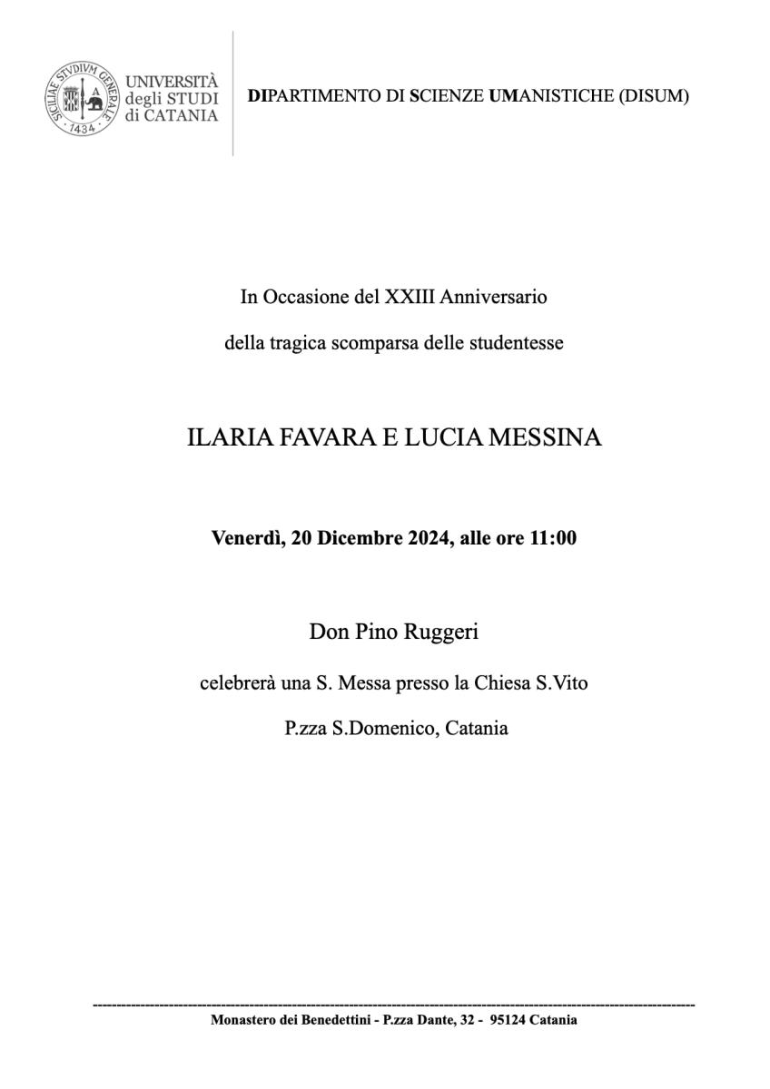 Si comunica che venerdì 20 dicembre 2024, alle ore 11:00, presso verrà celebrata una S. Messa in occasione del XXIII anniversario della tragica scomparsa delle studentesse Ilaria Favara e Lucia Messina.