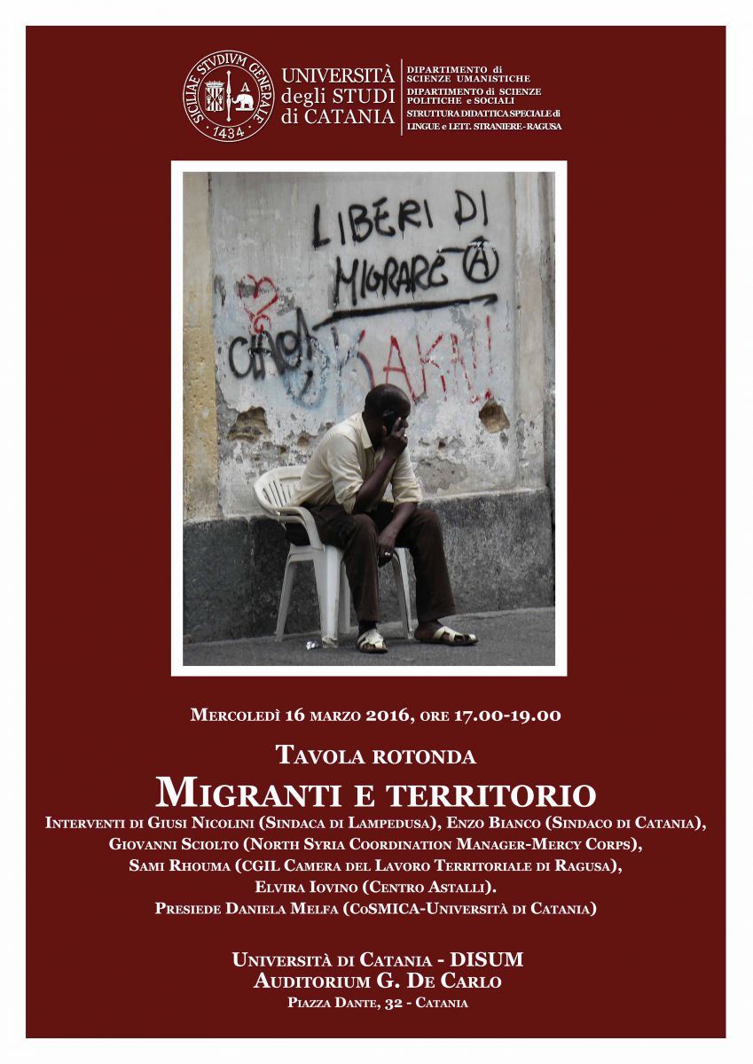 Migranti e territorio Mercoledì 16.3.2016 alle 17,00 in Auditorium si svolgerà una Tavola rotonda dal titolo Migranti e territorio. Programma completo dell'incontro (doc) Condividi Facebook Twitter Whatsapp Telegram Email