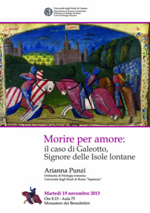 Il 19.11.2013 alle ore 8,15 nell'aula 75 la Prof.ssa Arianna Punzi -ordinario di Filologia romanza presso l'Università degli Studi di Roma "Sapienza"- terrà una lezione dal titolo Morire per amore: il caso di Galeotto, Signore delle Isole lontane.